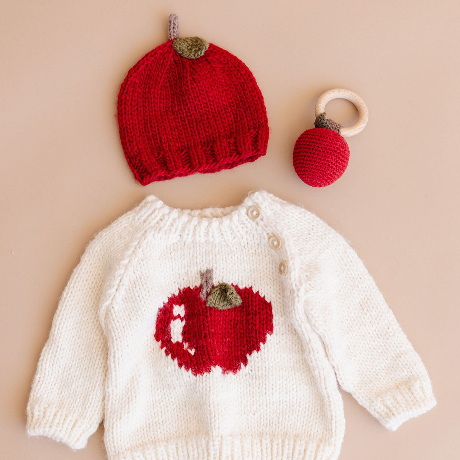 Keep fall crisp with our Apple Hat. This Red beanie features a Tan stem and Moss leaf, and pairs perfectly with our Apple Pullover Sweater and Cotton Crochet Apple Rattle Teether.