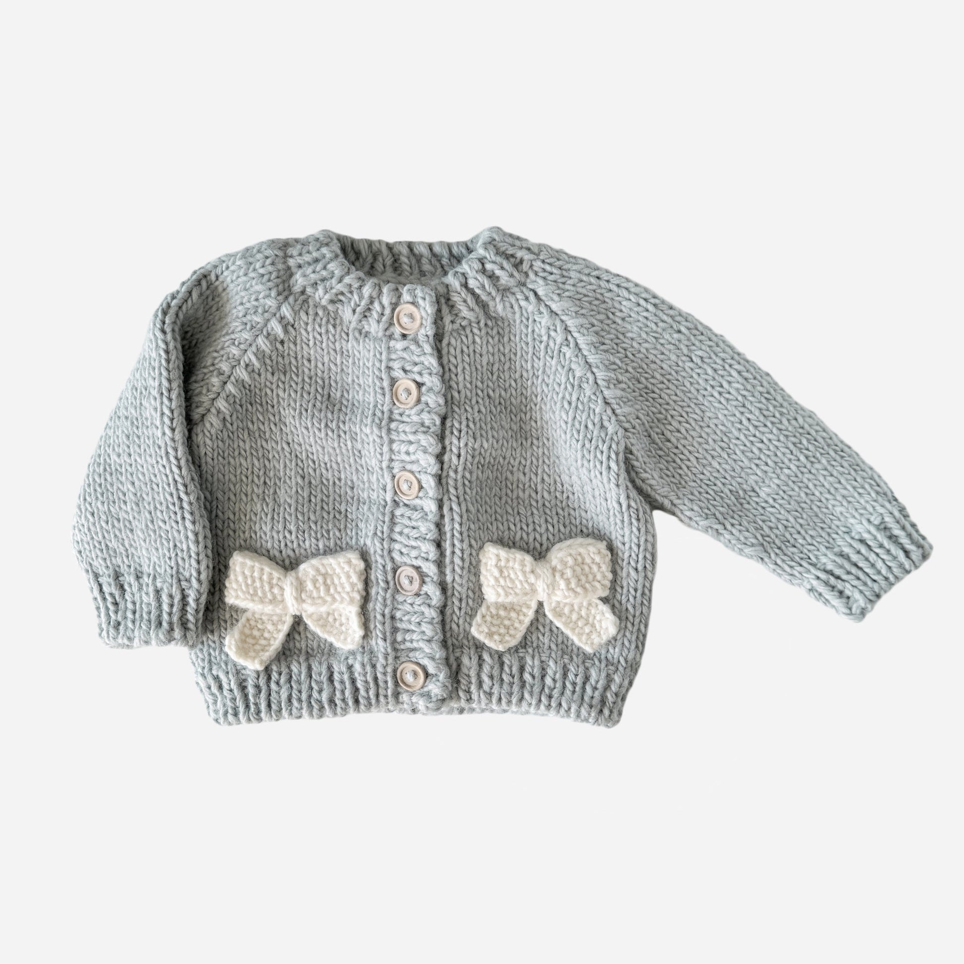 Keep it cute and classy with our Bow cardigan in Bowie Grey. This Bowie Grey features two Cream bows and five wooden buttons.