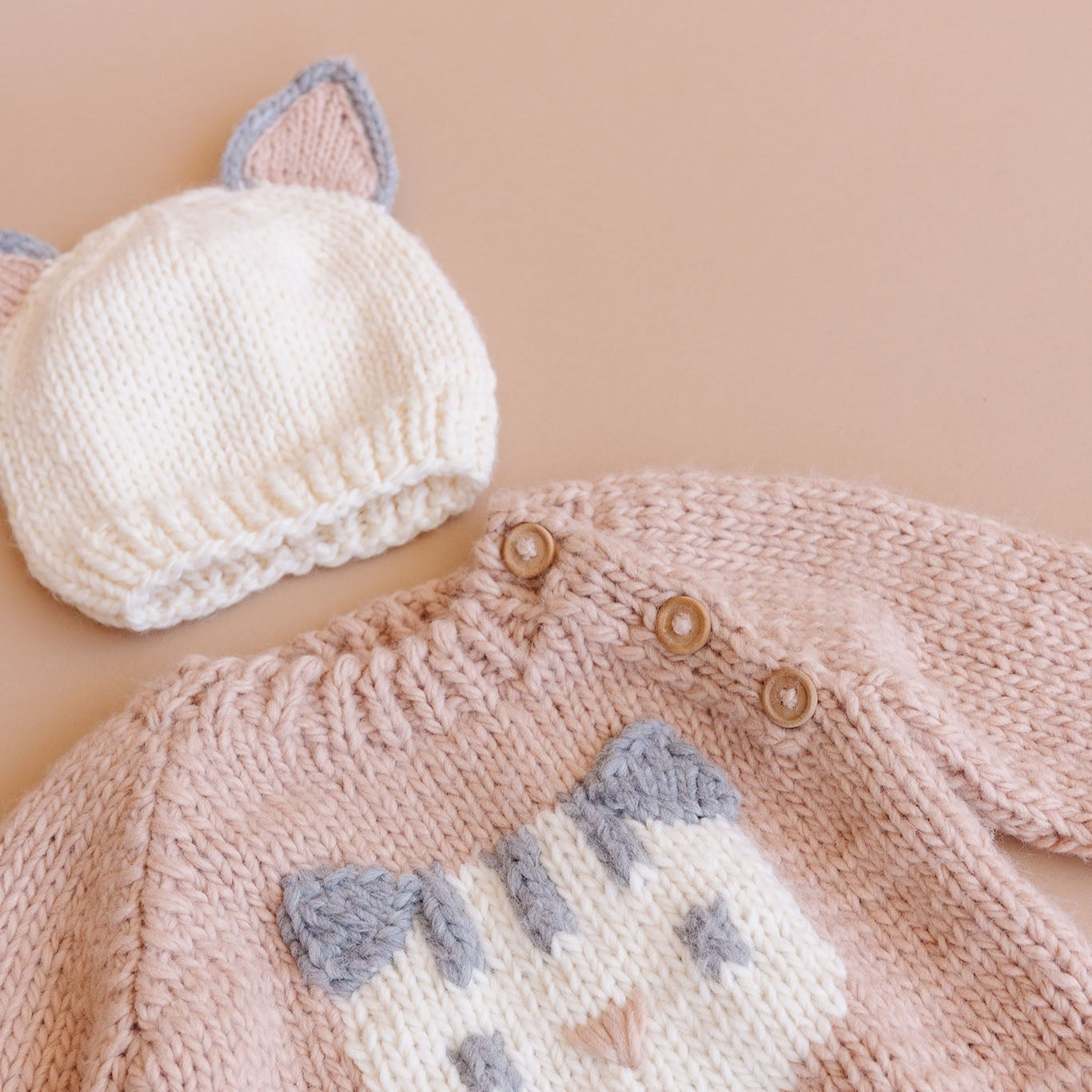 Make your little one as cute as a kitten with our Cat Hat in Cream. This cosy beanie features Blush and Grey ears, pair with our Cat Pullover Sweater in Blush.