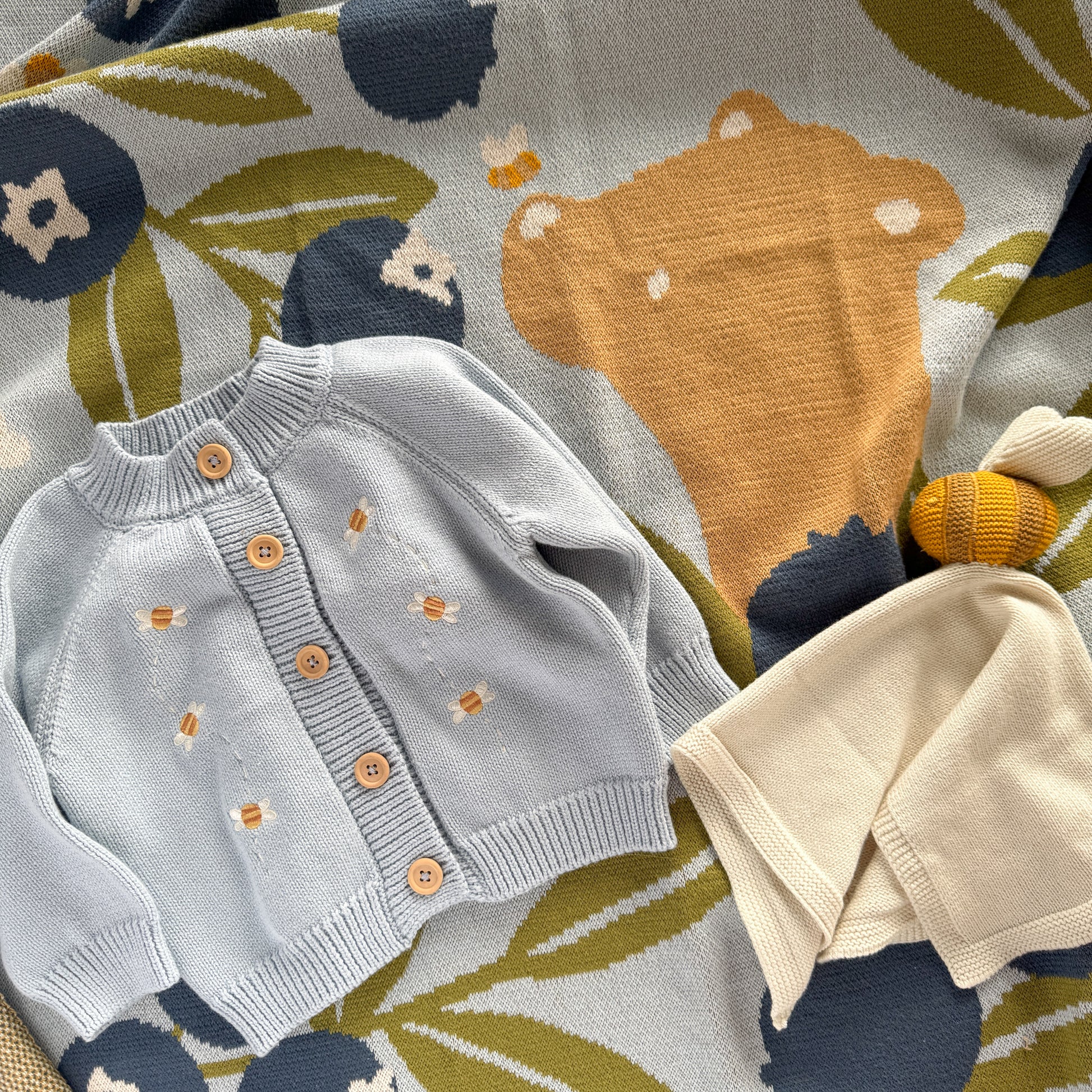 Buzz through the Blueberry Hill with our Cotton Bee cardigan. Featuring two lines of flying bees on a Blue cardigan, this 100% cotton piece pairs perfect with our Bee lovey, swaddle, teether, and other .