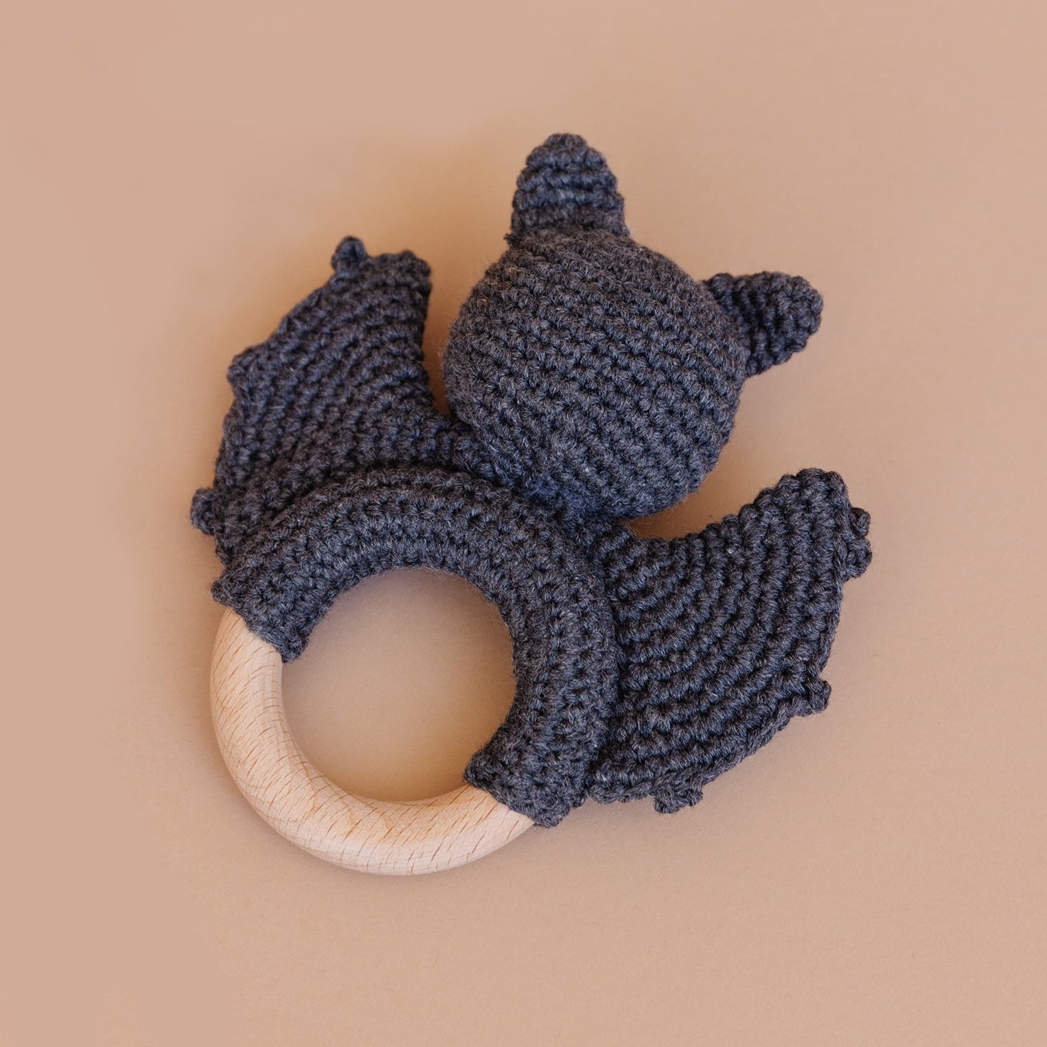 There's no toil and trouble with our Bat Teether in dark grey. Made from soft cotton and beech wood for safe chewing, this rattle is the perfect blend of sensible and spooky.