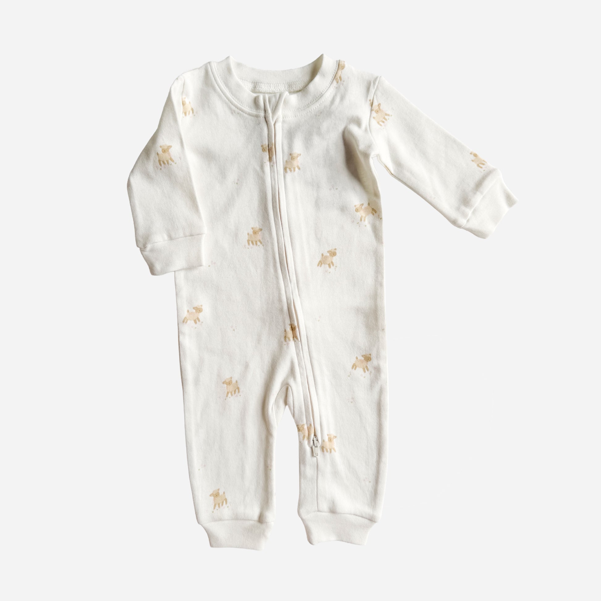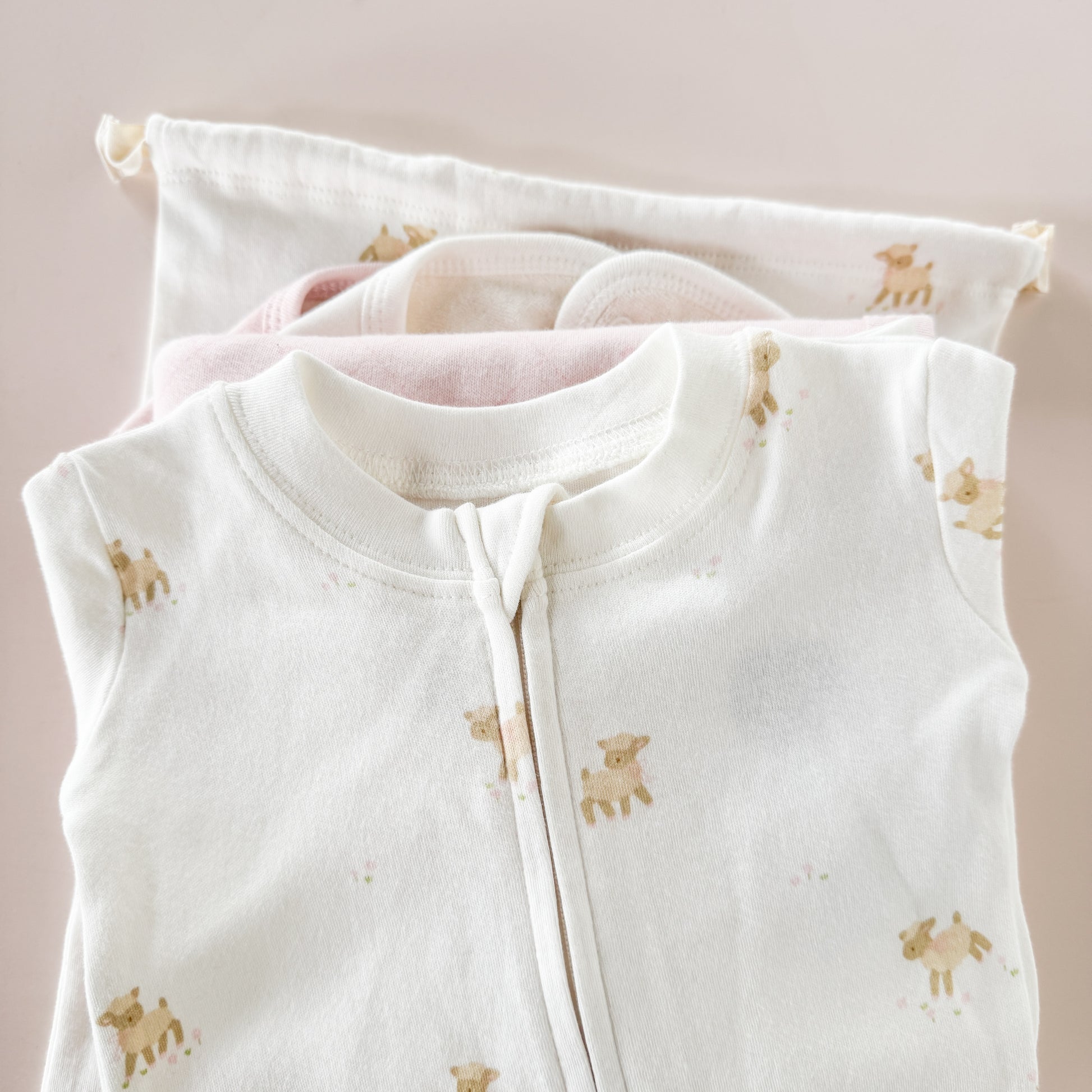 Get little ones cozy in our Layette long sleeve zipper romper, available in four sizes. Featuring our Lamb pattern with pink bows.
