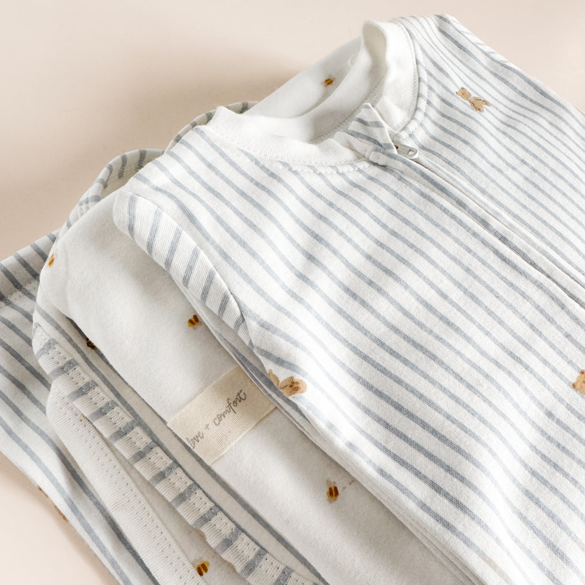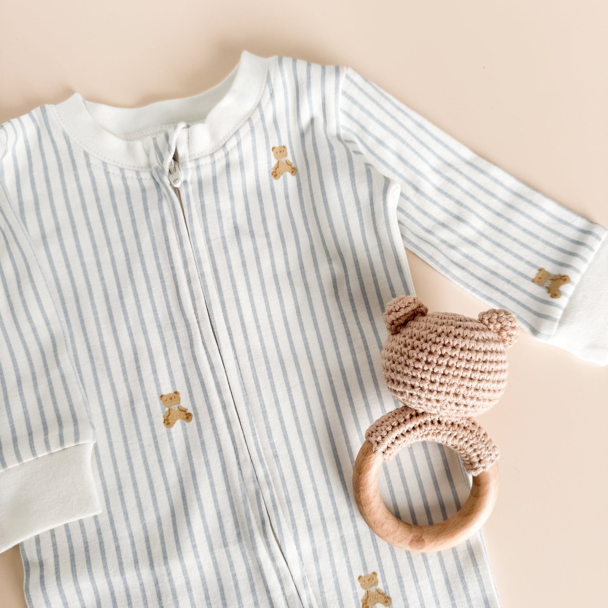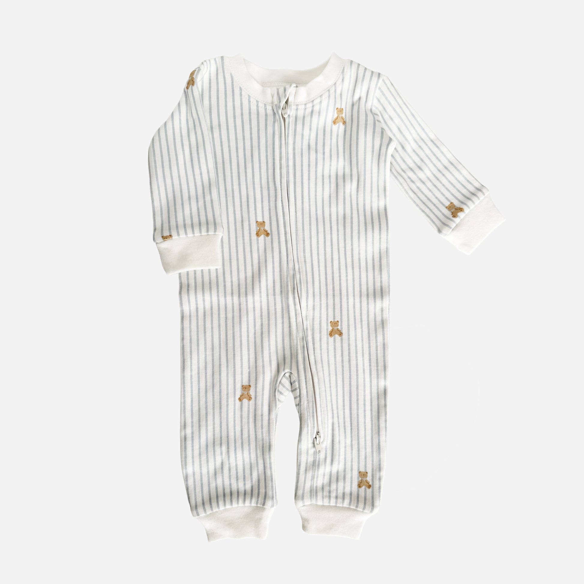 Get little ones cozy in our Layette long sleeve zipper romper, available in four sizes. Featuring our Teddy Bear pattern with blue stripes.