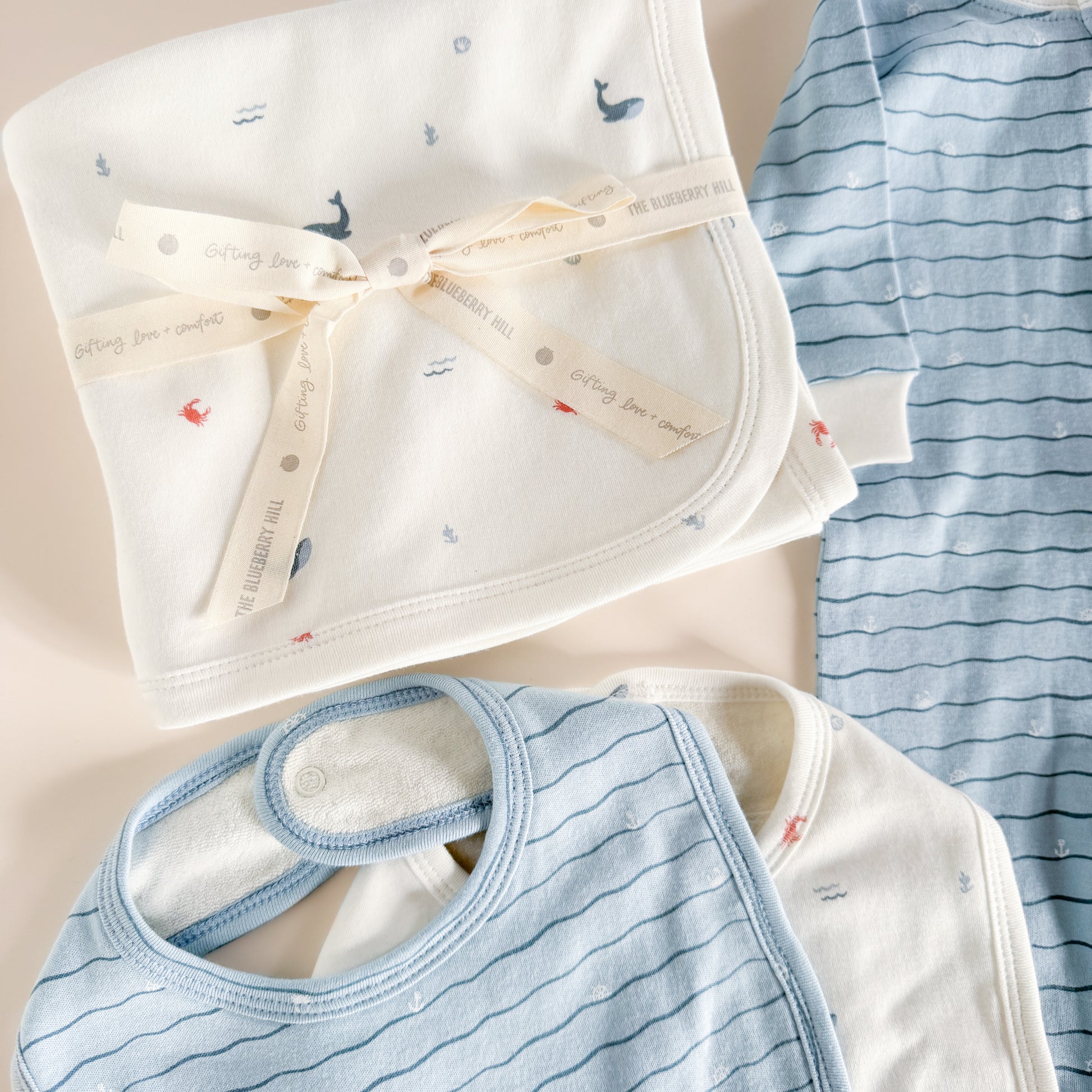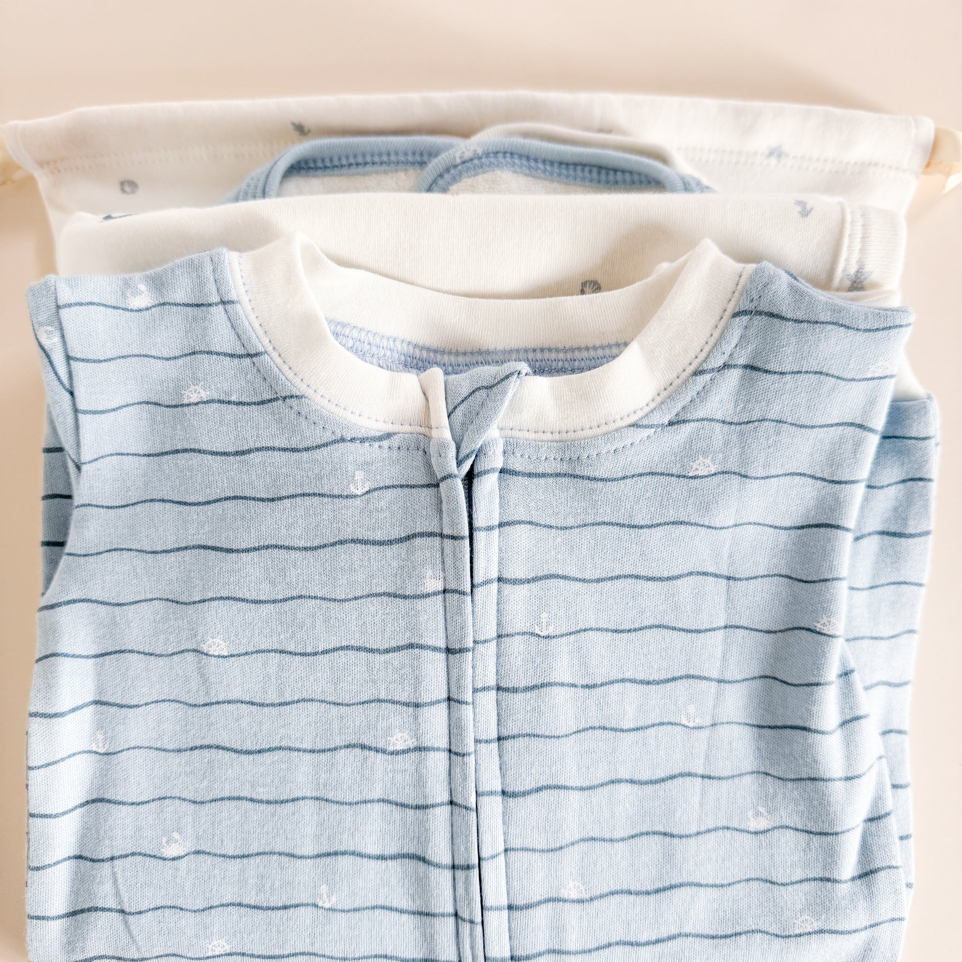 Our Layette sets make the sweetest gifts. Featuring two adorable patterns, Nautical and Waves. Available in four sizes.