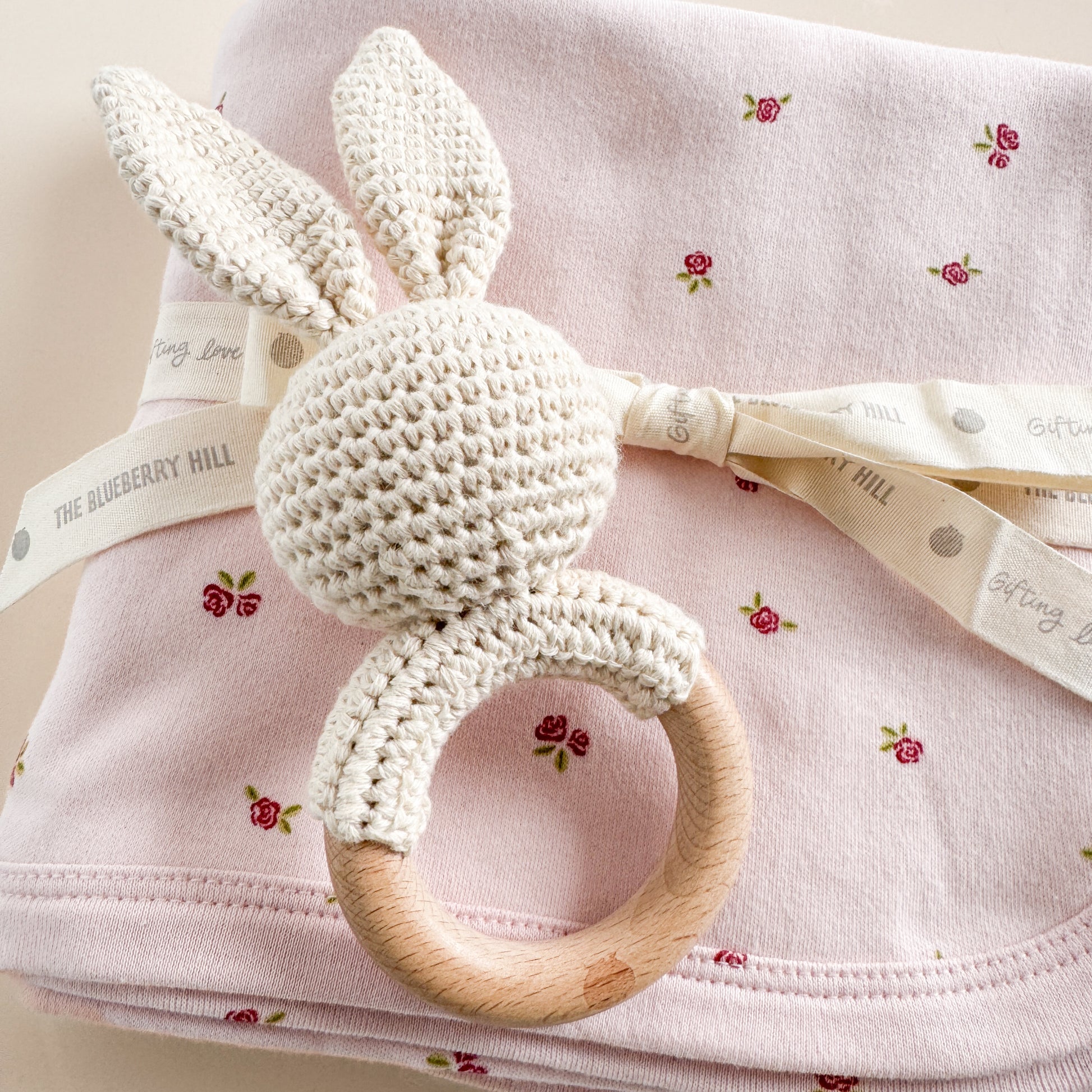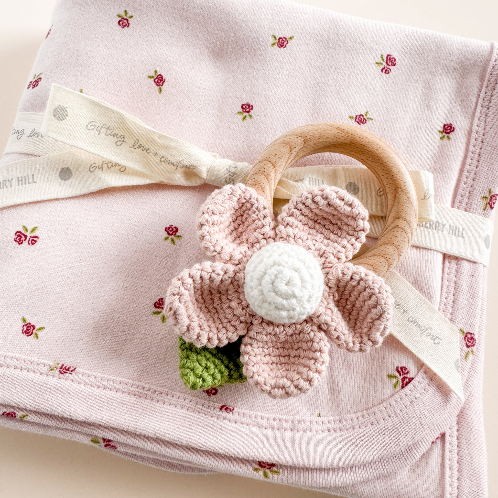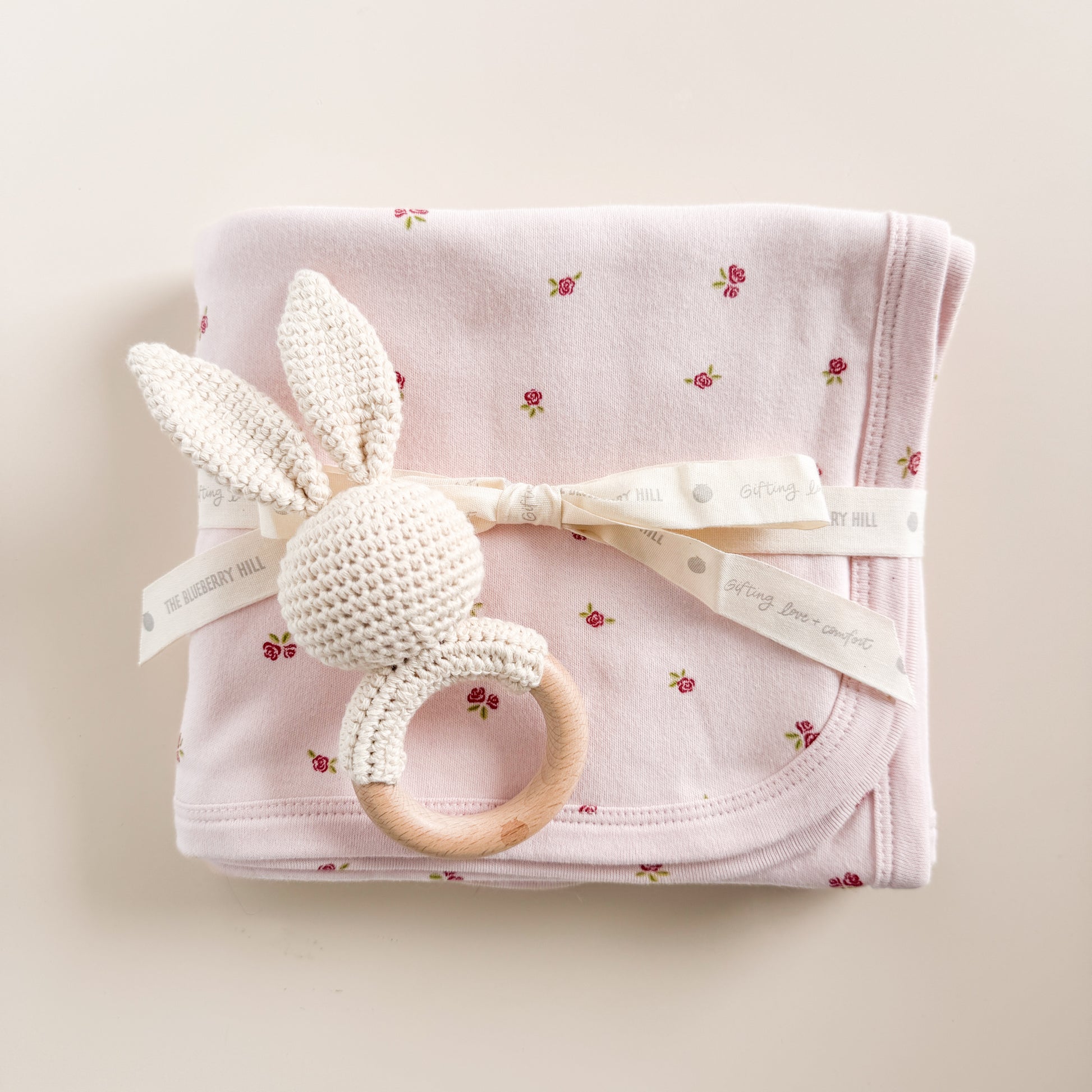 Wrap little ones up in our Layette swaddle blanket. Featuring our Rose pattern in Pink.